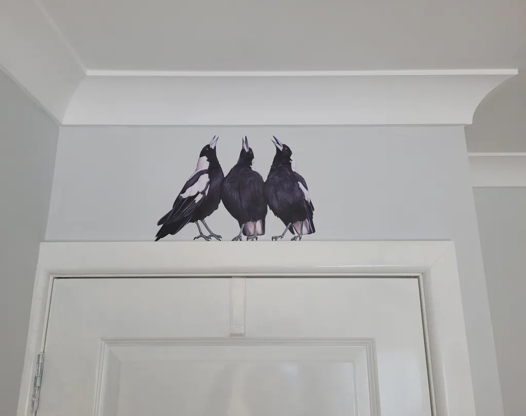 I can almost hear this trio of warbling magpies calling every time I walk through the door to my bird photography studio where I've placed the decal.