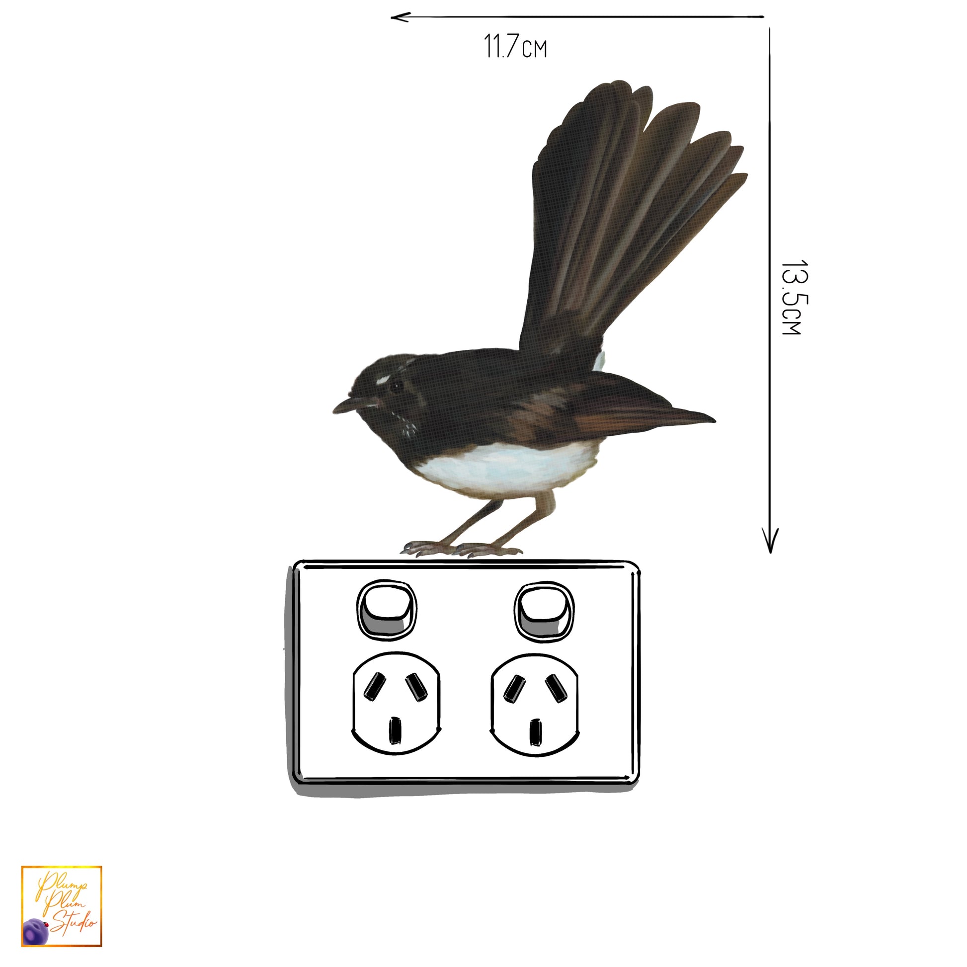 Australian Willy Wagtail, a visitor to most Australian backyards. They are a full of spunk and character and will brighten anyone’s day. He’ll look fantastic perched above your door, or couch, light switch anywhere in the house, be it the nursery, lounge room, or hallway. This piece is suitable for all clean, smooth surfaces, inside and out.