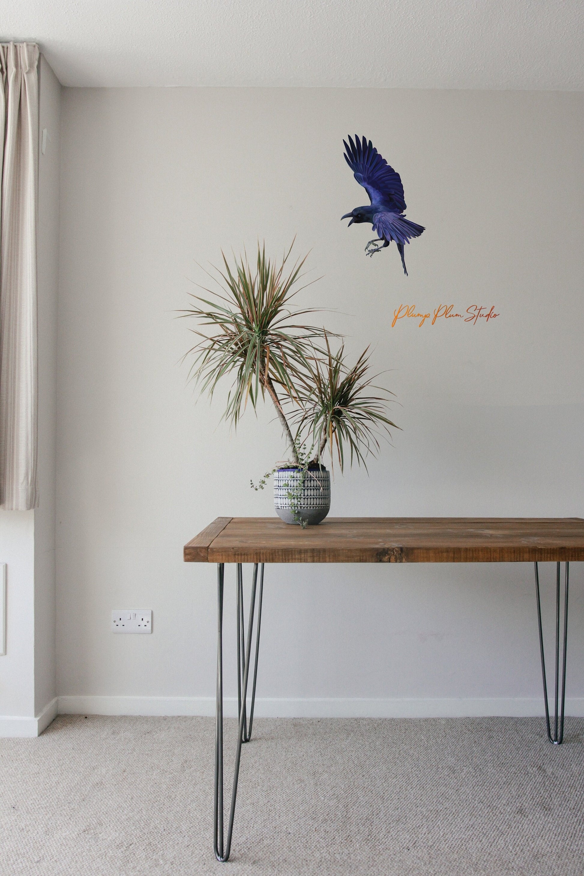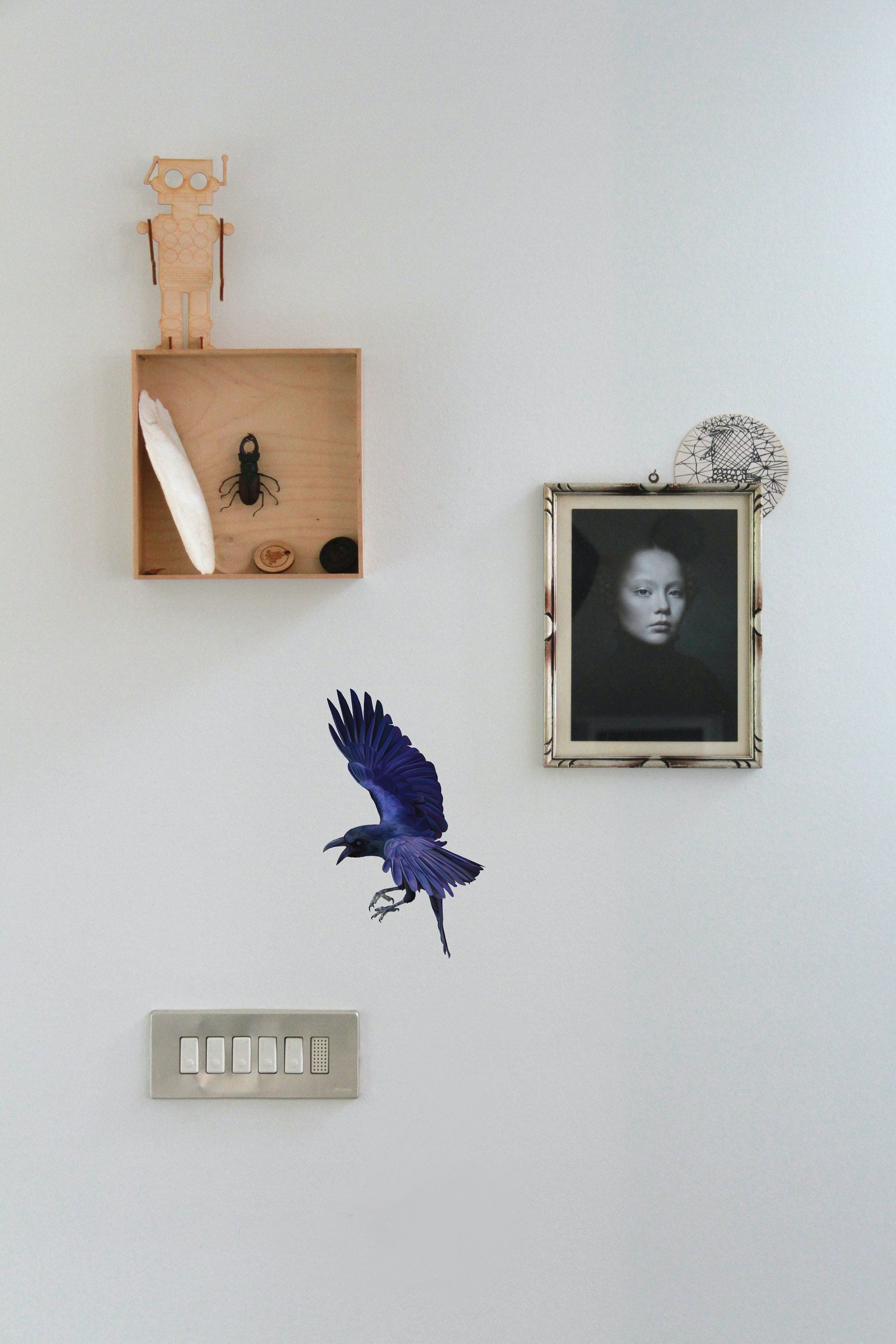 Beautiful crow, Australian crows have blue eyes and gorgeous iridescent black plumage. They are full of character, loud and vibrant. He’ll look fantastic flying along your wall, anywhere in the house, be it the bedroom, lounge room, or hallway.