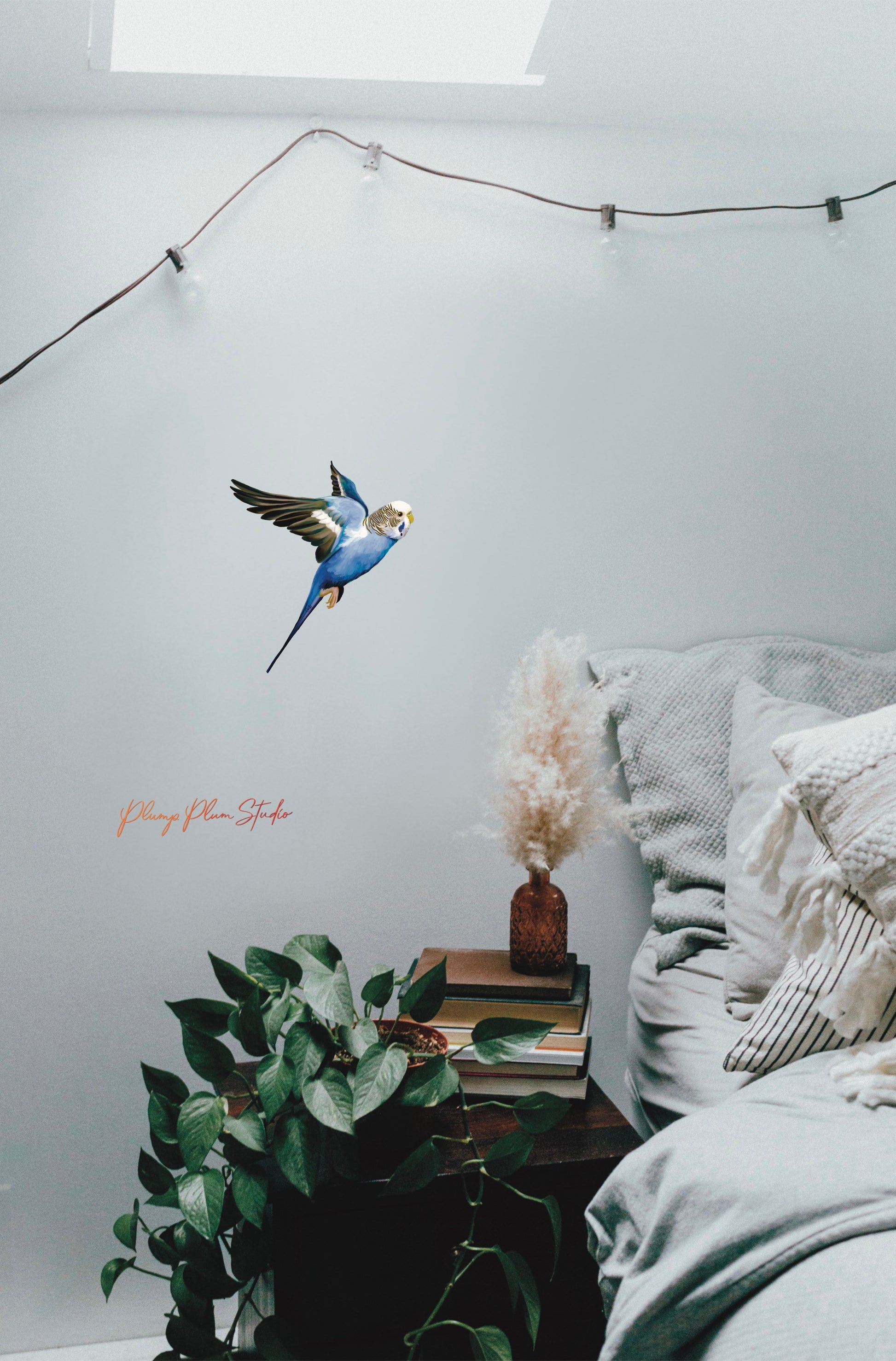 Flying Blue Budgie decal, Australian blue/white budgie sticker, light switch decal, cute bird, textured vinyl car decal, indoor/outdoor