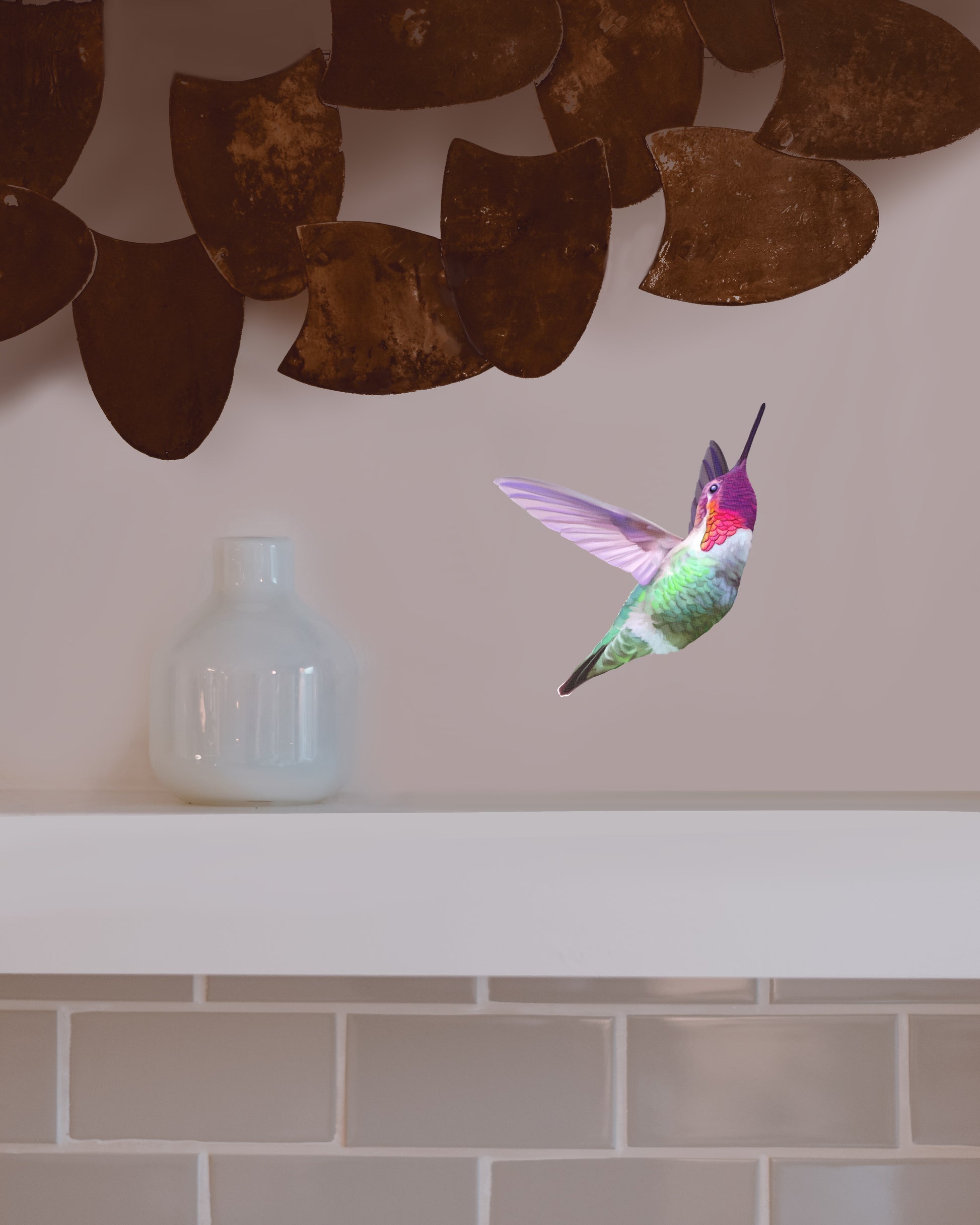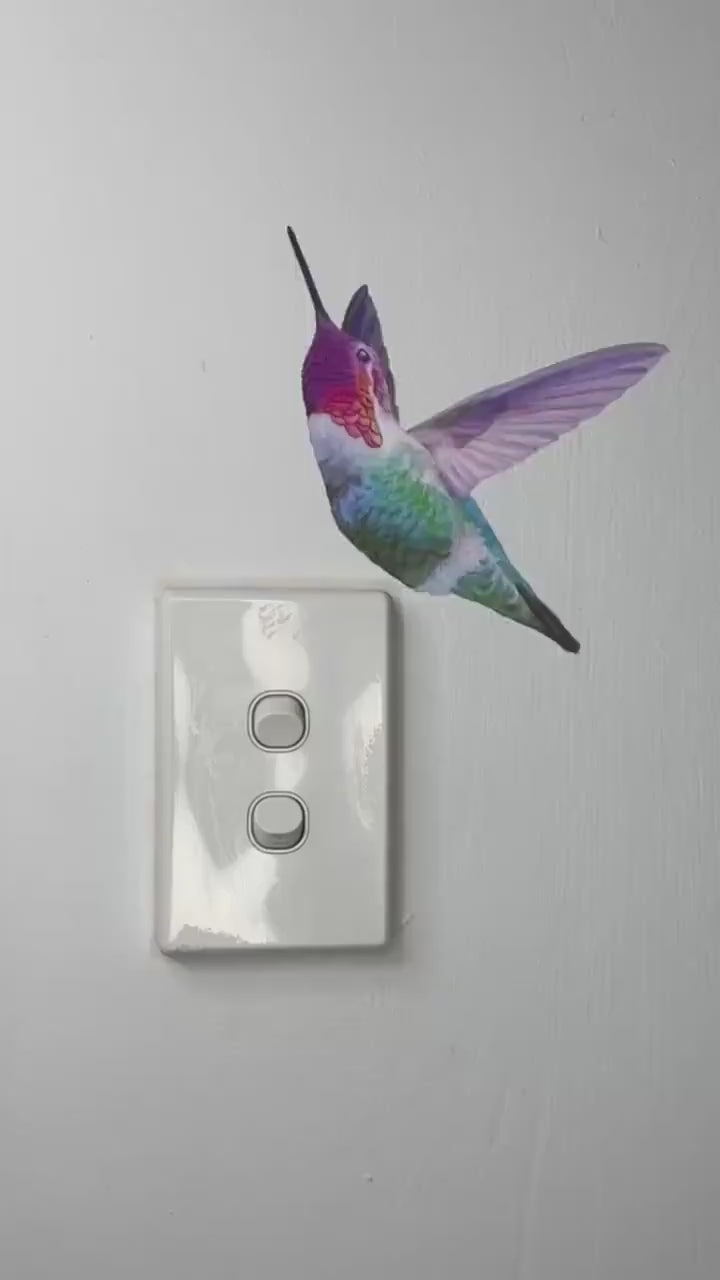 Colourful Hummingbird, iridescent flying jewels that spark joy as soon as you see them. He’ll look fantastic flying above your door, couch or light switch anywhere in the house, be it the nursery, lounge room, or hallway.