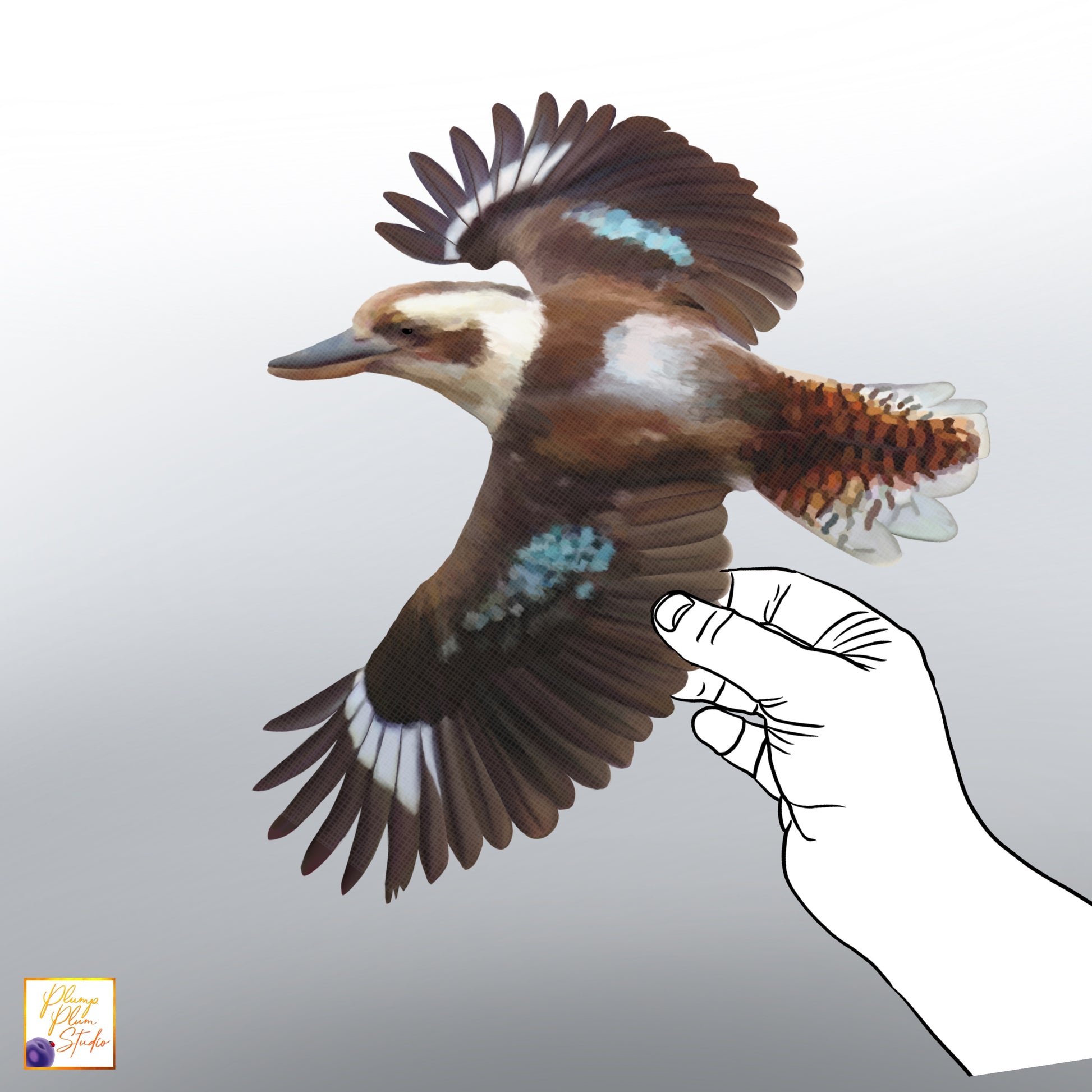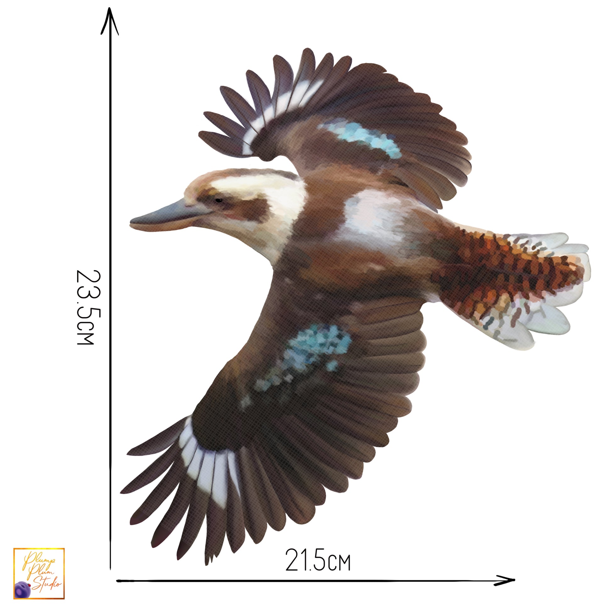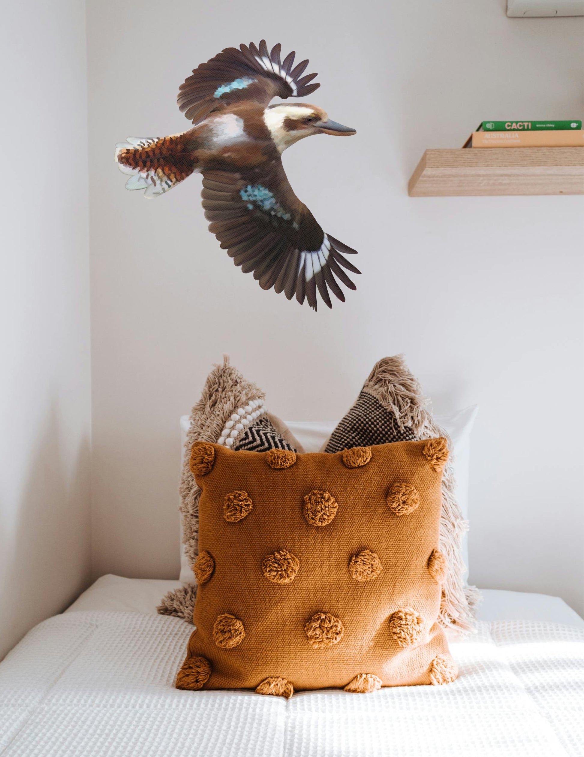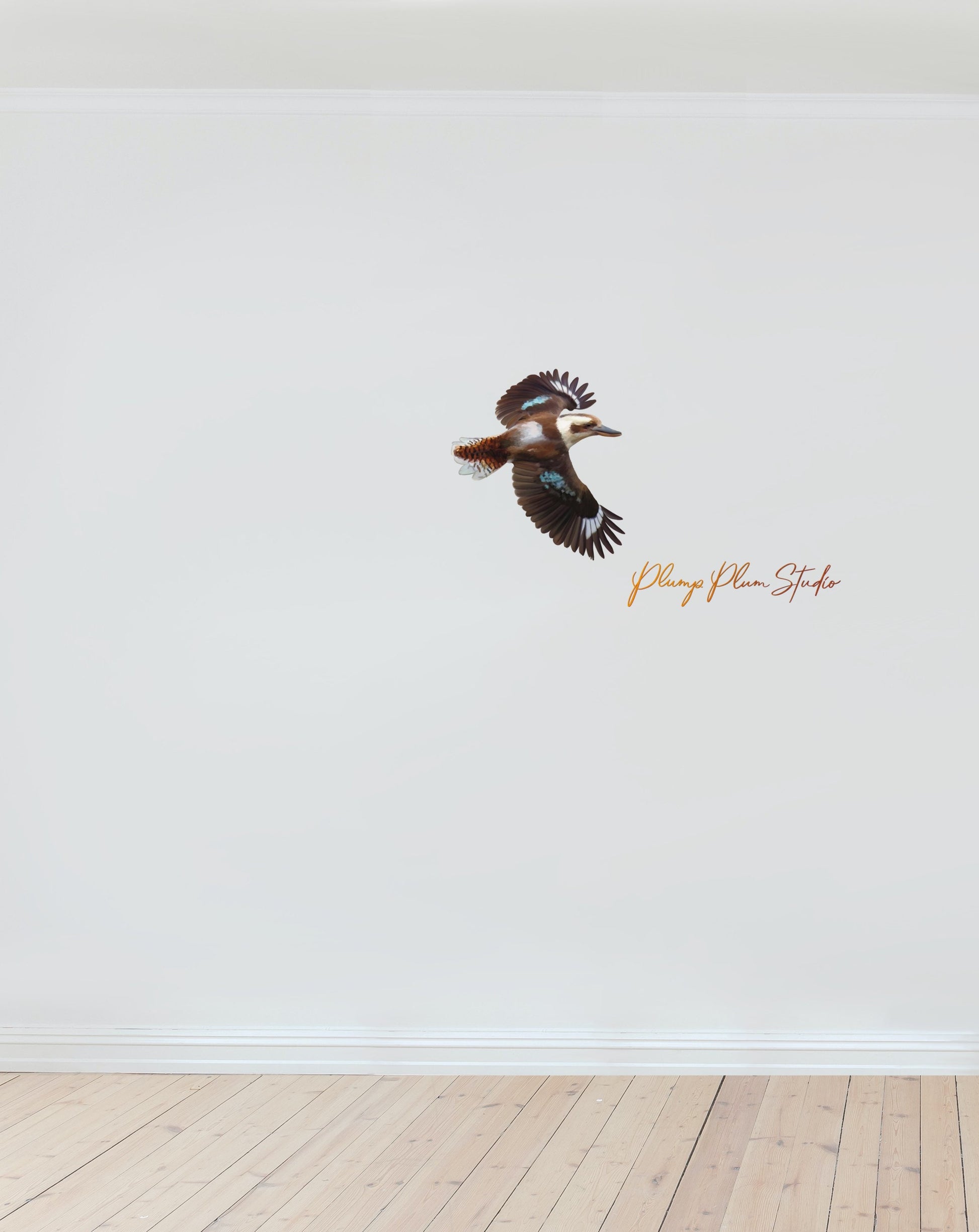 Beautiful Kookaburra in flight, one of Australia’s most iconic birds. Their laughing call is well known to all Australians, they are characterful and vibrant backyard visitors throughout Australia. He’ll look fantastic flying along your wall, anywhere in or out of the house, be it the nursery, lounge room or on your car.