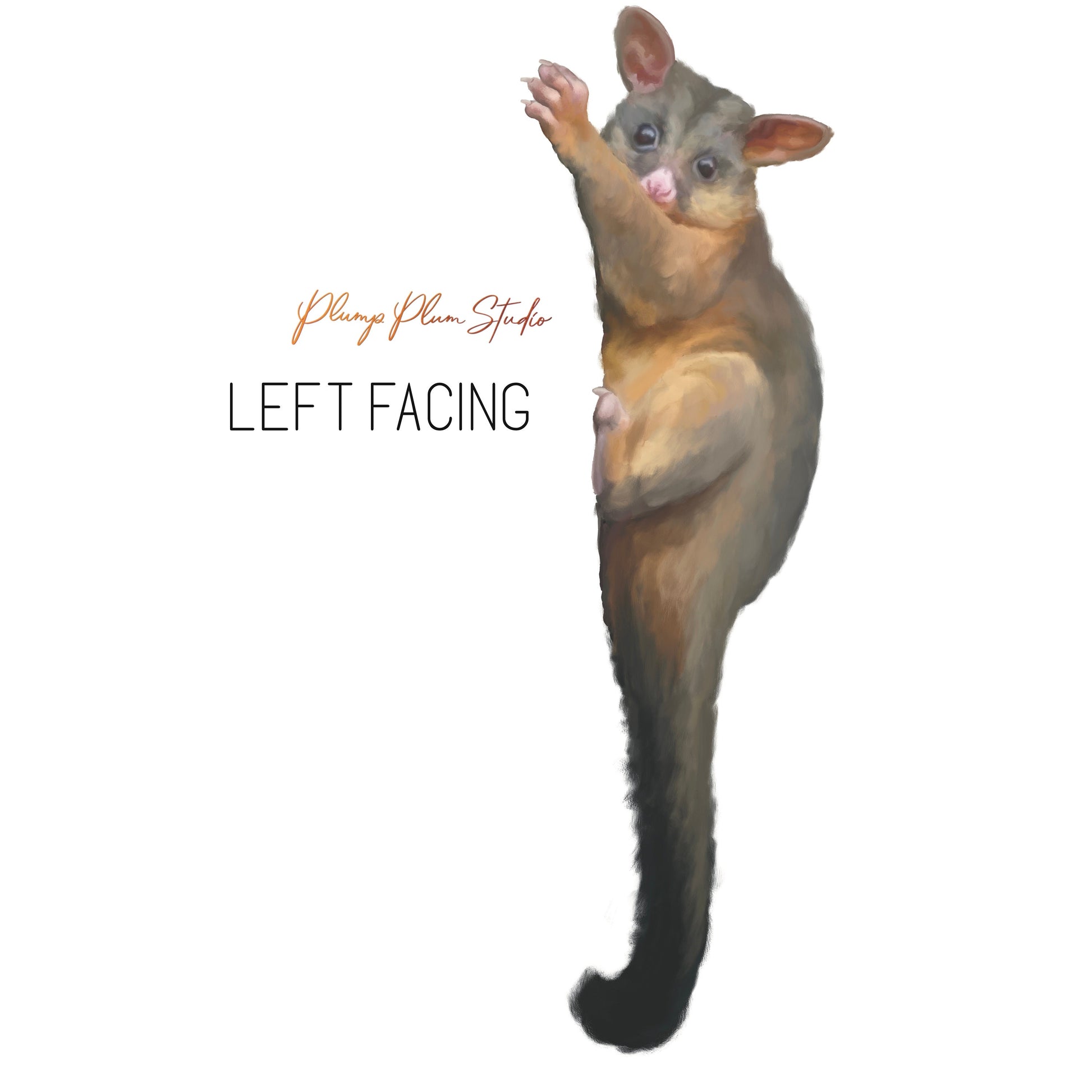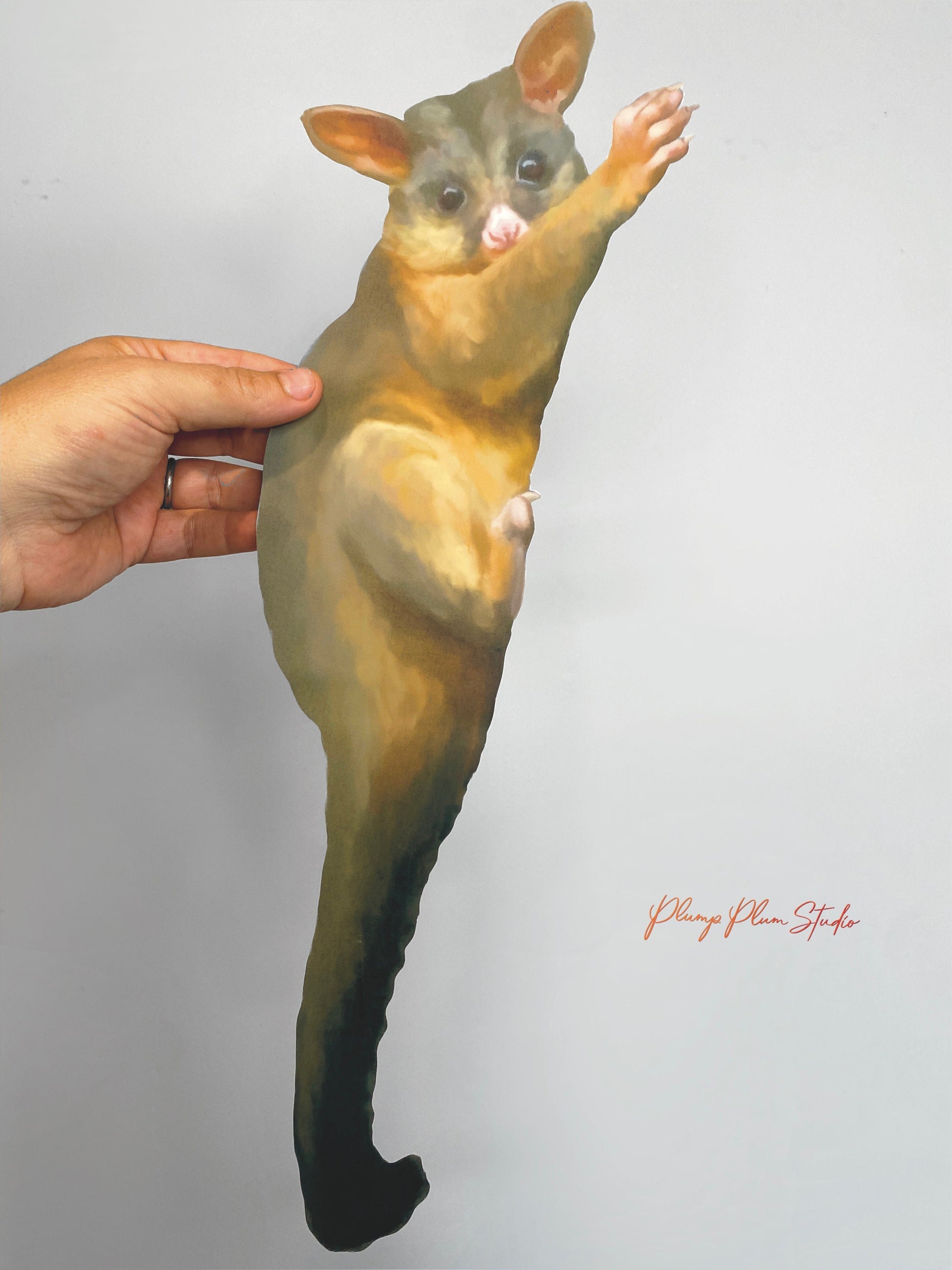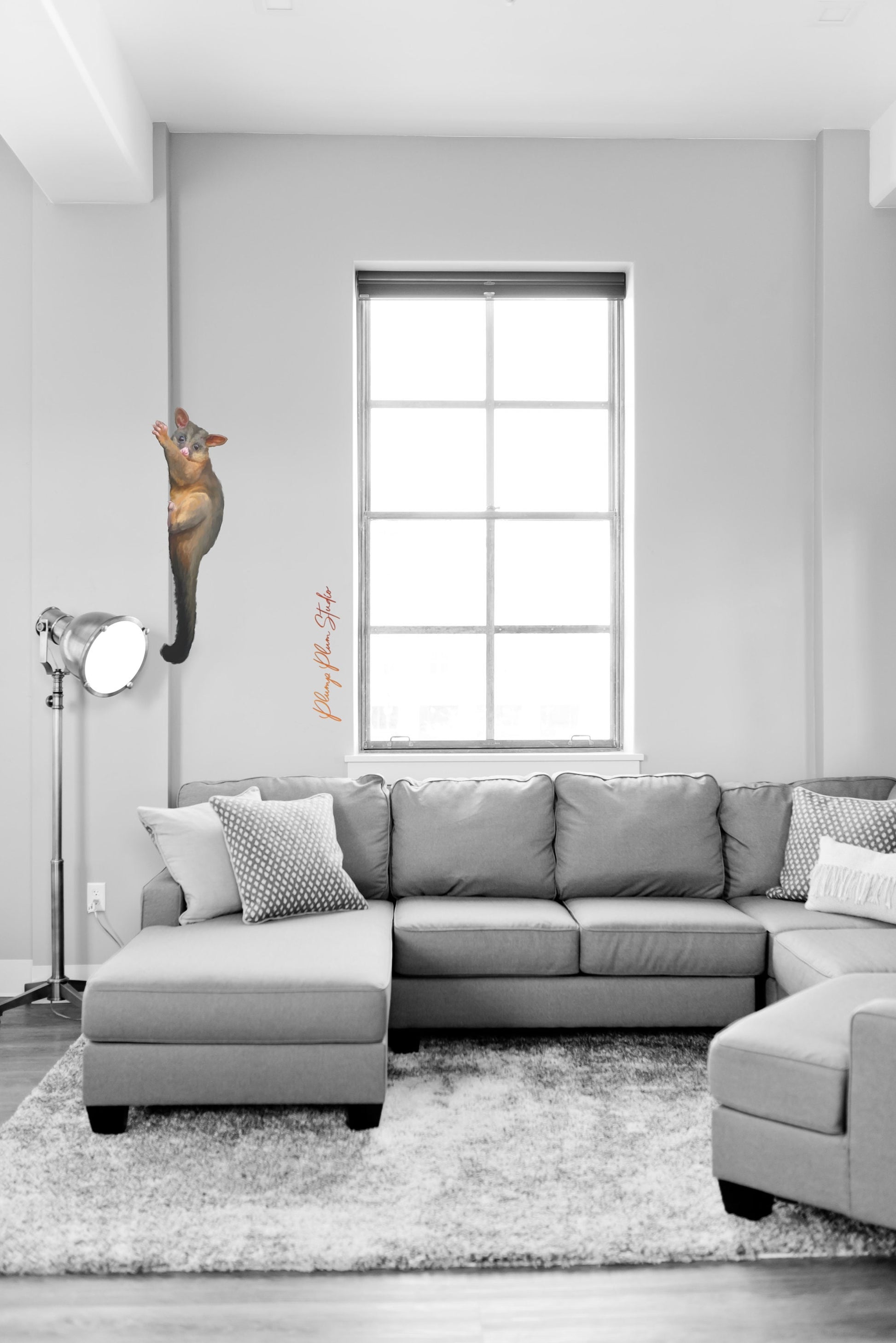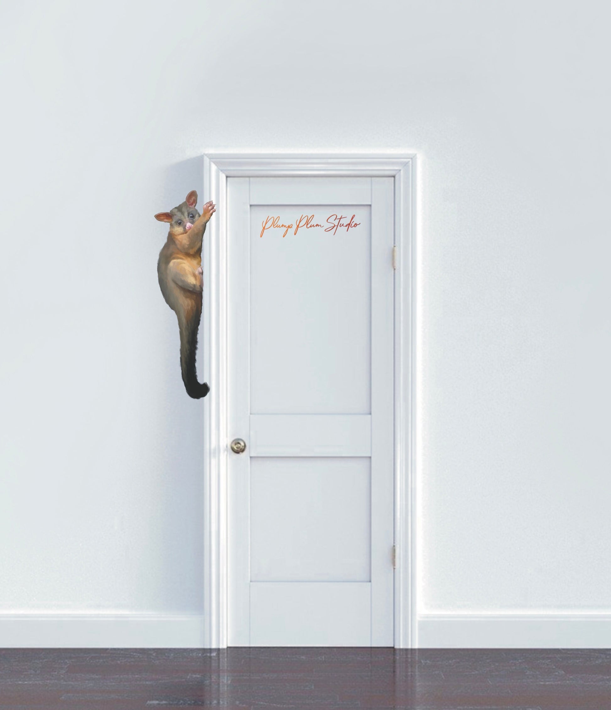 One very cute Brushtail Possum, probably the most common visitor to many Australian backyards. I have illustrated the possum as realistically as possible, so that you can have a little of the Aussie bush in your home. You can position your possum outside on your wheelie bin, or inside on a door, or on a wall, down the end of the hallway, above the kids' bed, your imagination is the limit!