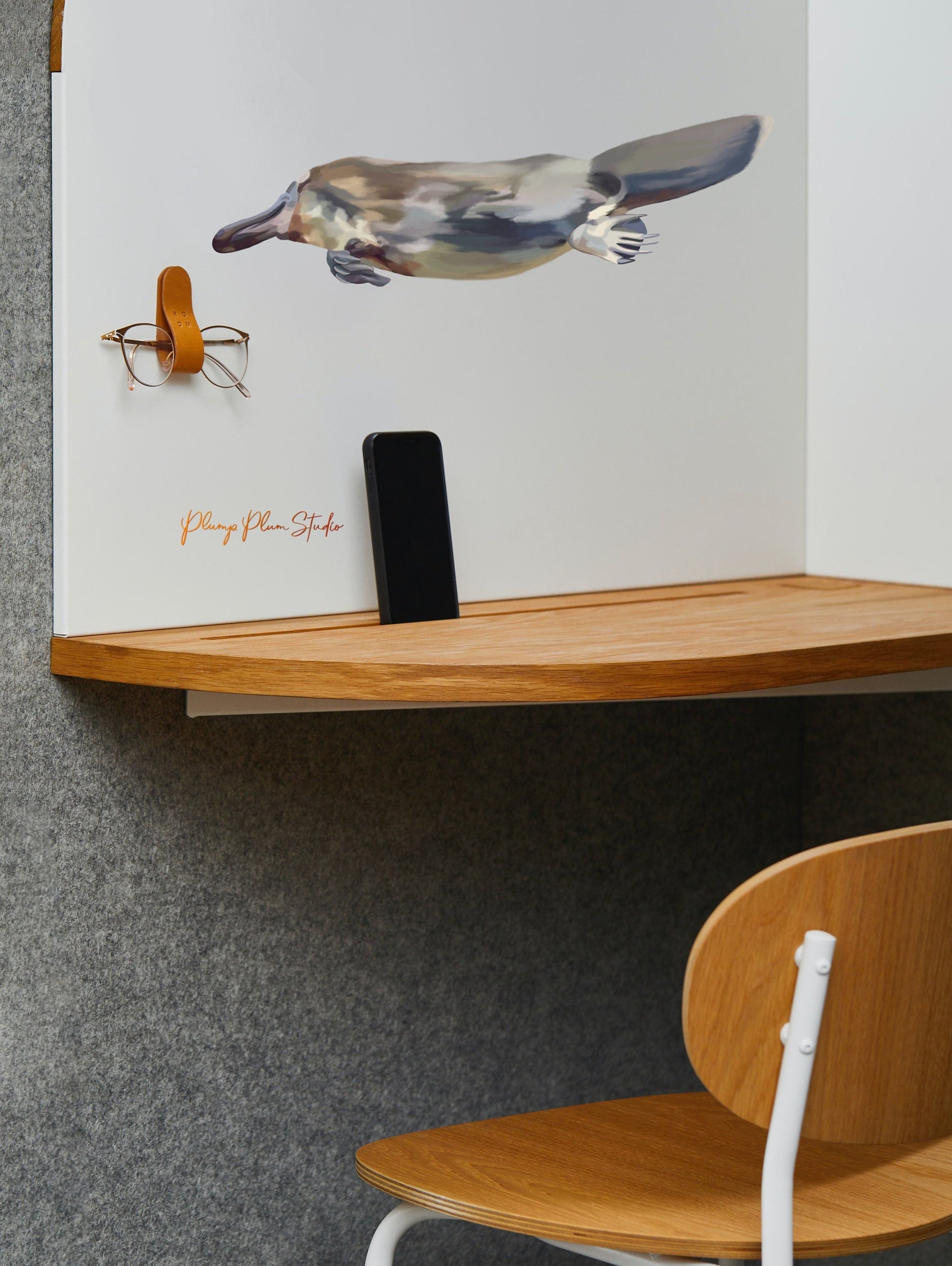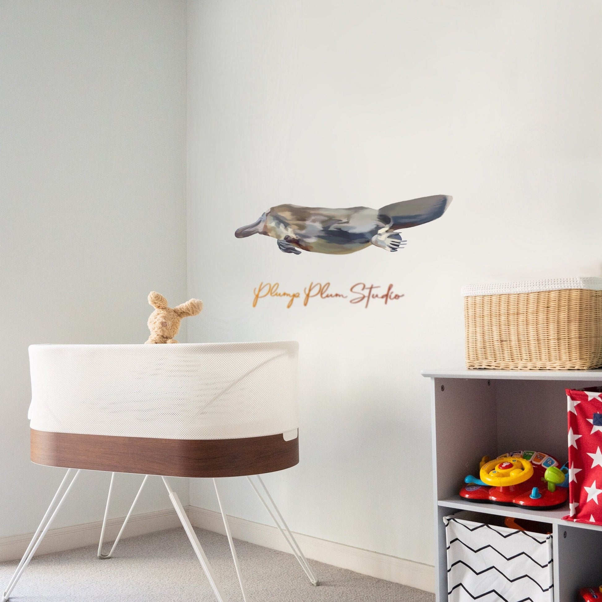 One swimming platypus, submerged in the creek that is his home. Realistically illustrated. One of the many cute and unusual Australian animals. You can reposition him as many times as you like, put him on a door, or on the wall, down the end of the hallway, above the kids bed, your imagination is the limit!