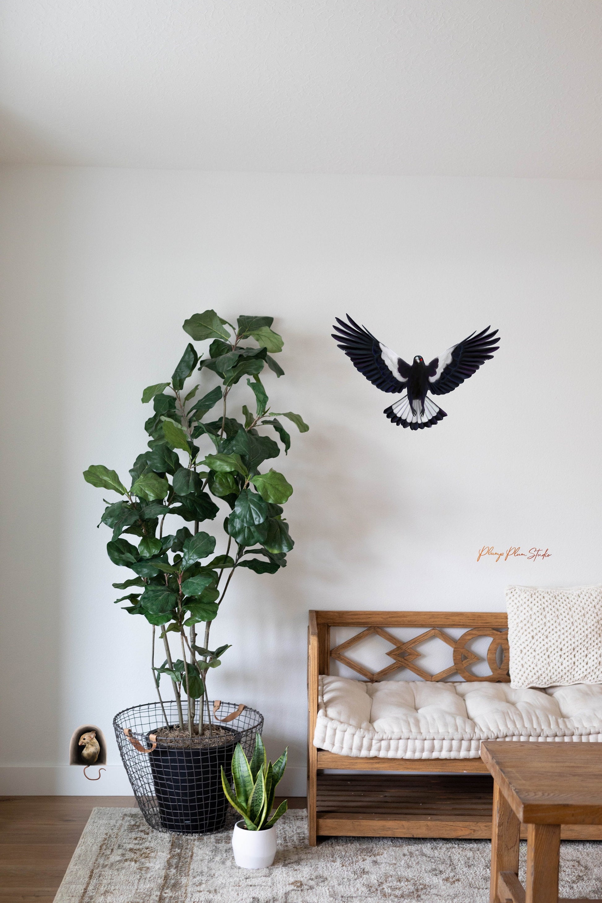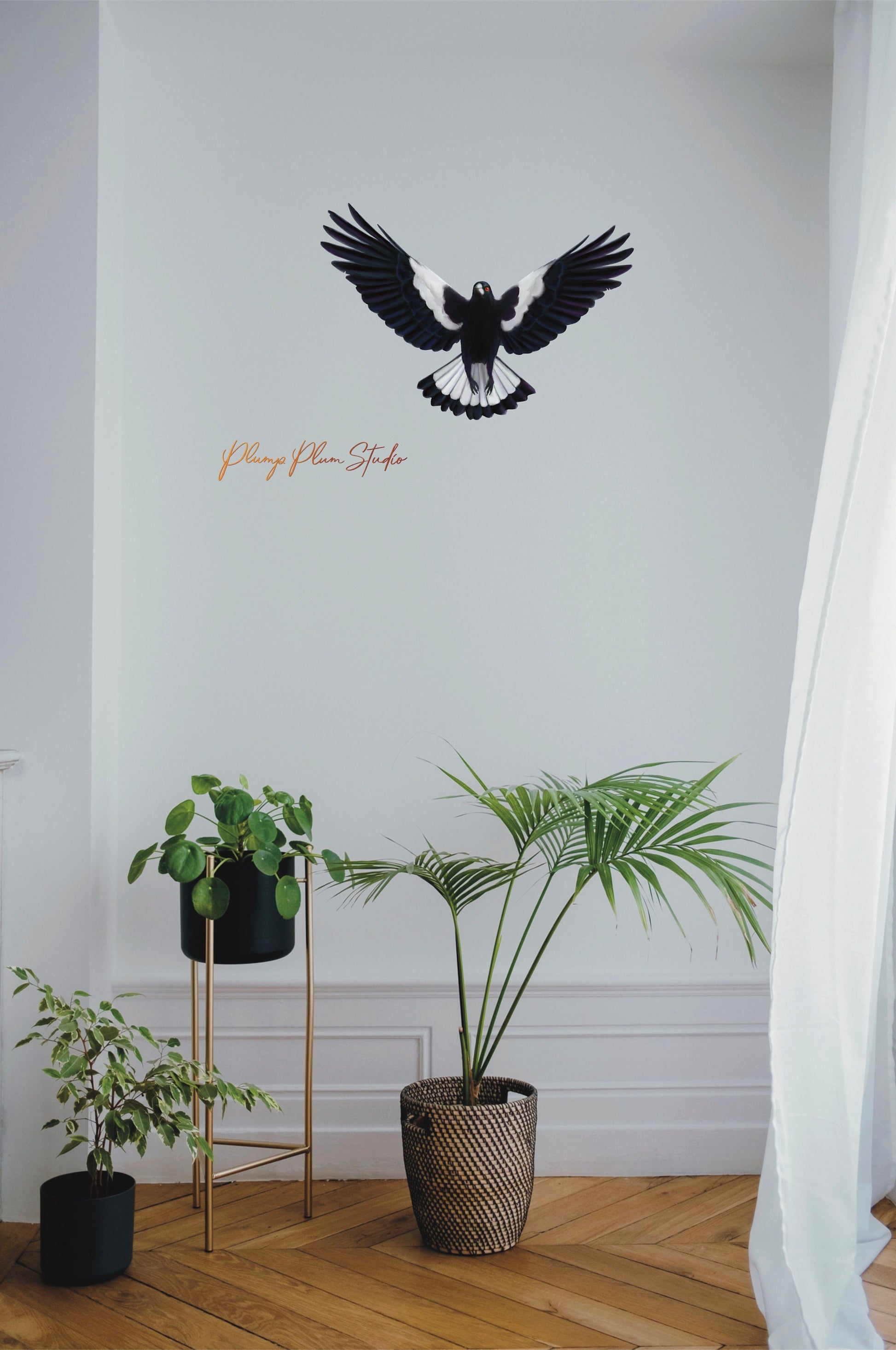 The iconic Australian Magpie, one of Australia’s most recognisable birds. They are full of character, loud and vibrant, and all Aussies to keep a wary eye out for them during Spring. He’ll look fantastic soaring above on your your wall, or anywhere in the house, be it the nursery, lounge room, or hallway.