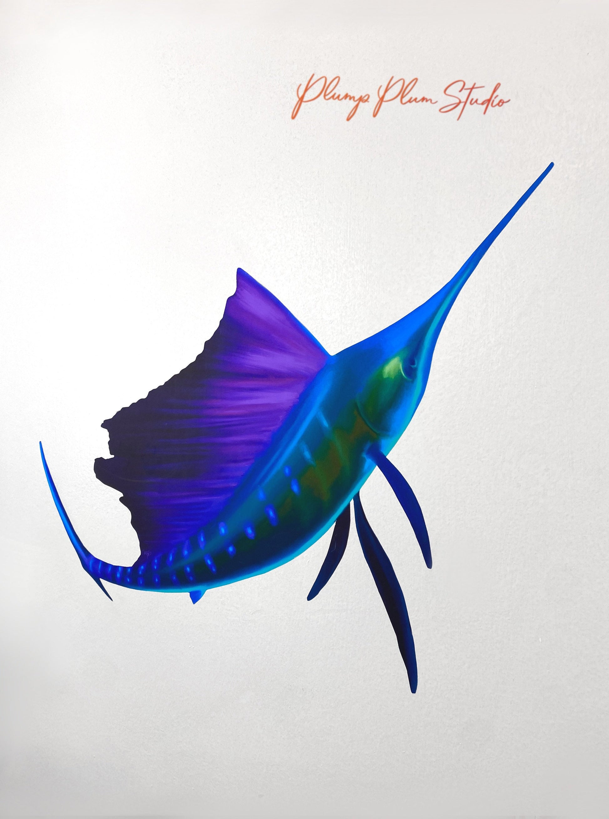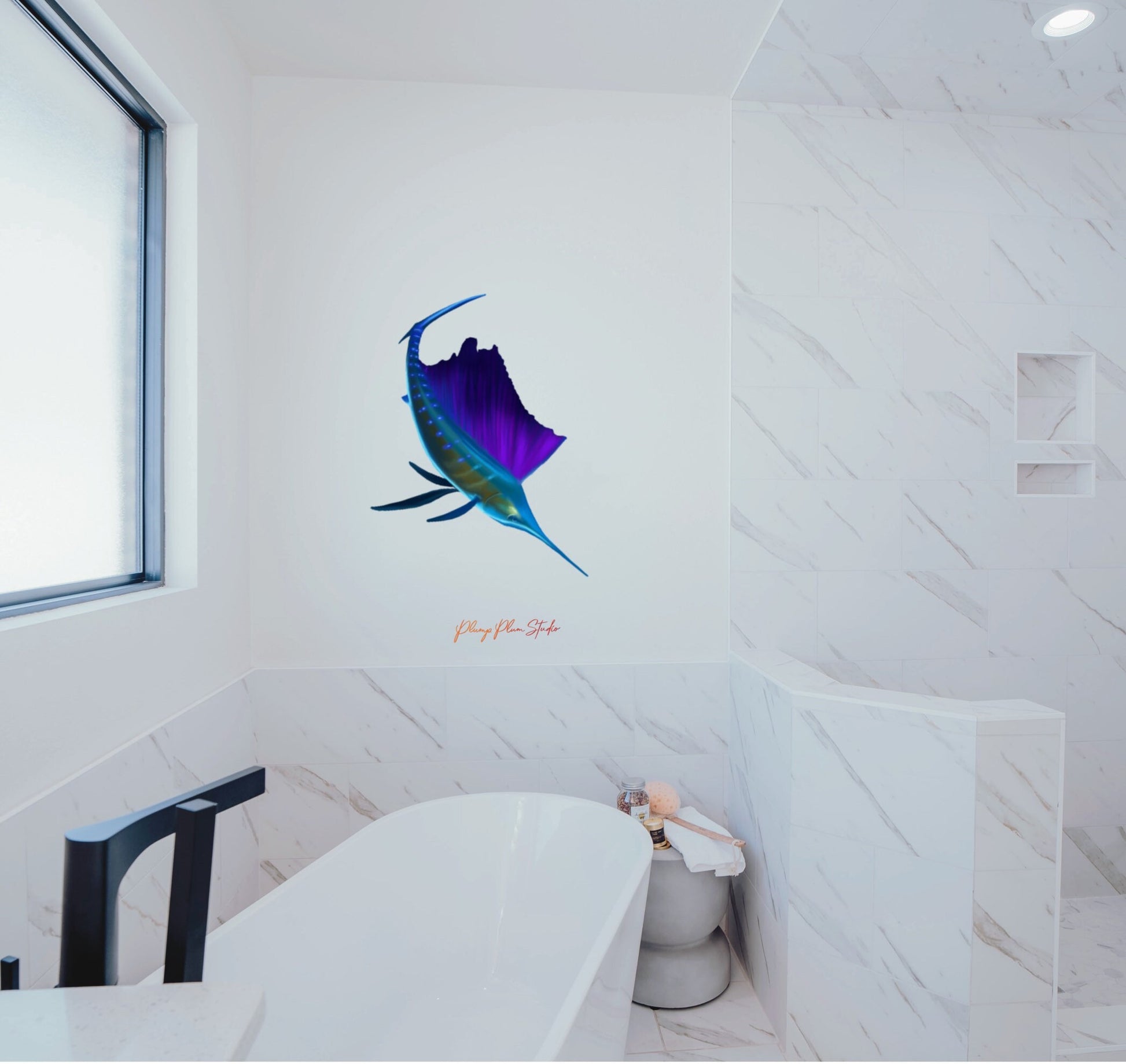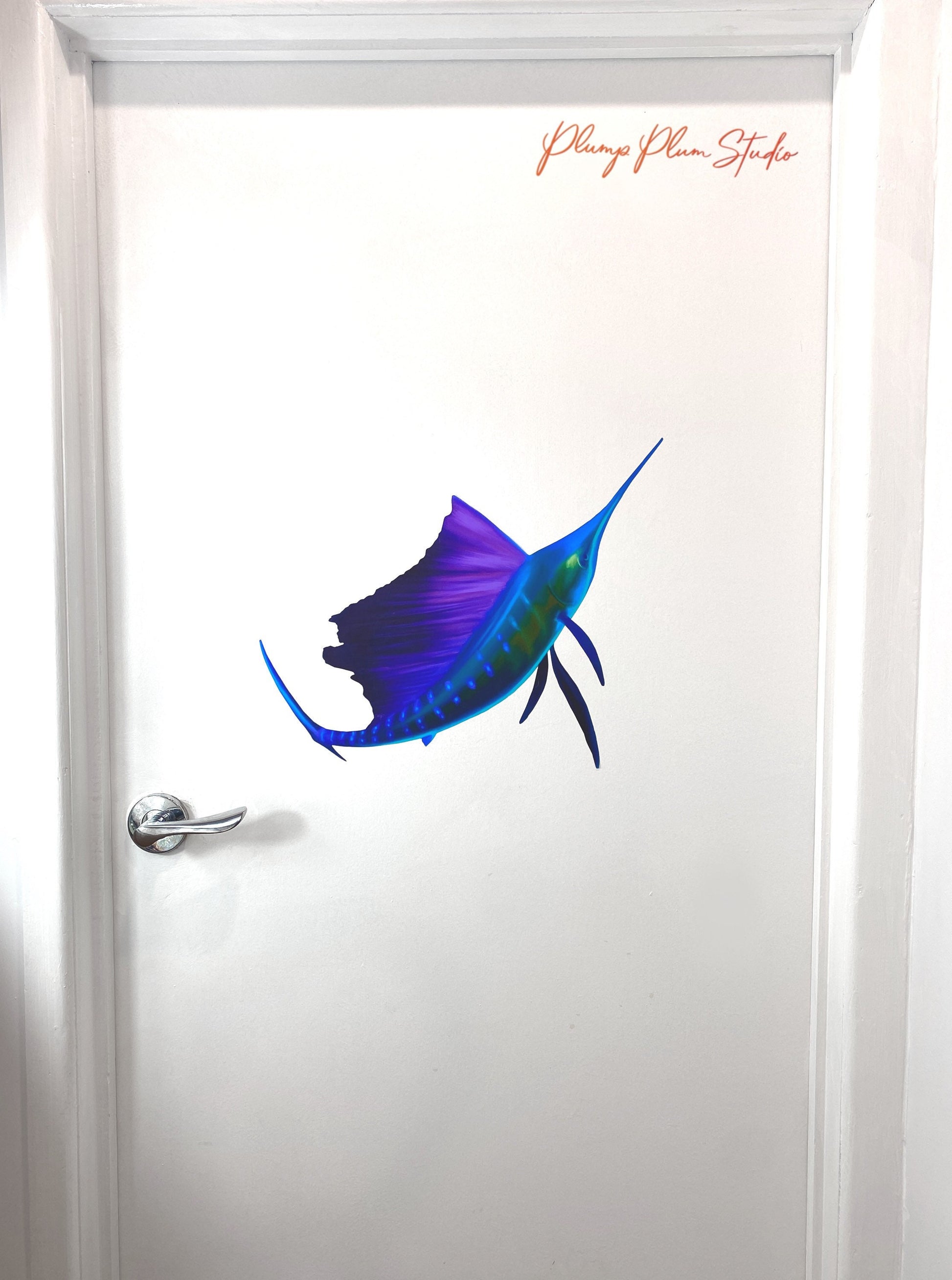 Large Sailfish decal, illustrated with marine vibrant colours. Suitable for any room in the house. Great to dance over your newborn, or swimming along your lounge room wall. Put him on your son’s bedroom door, your imagination is your limit!